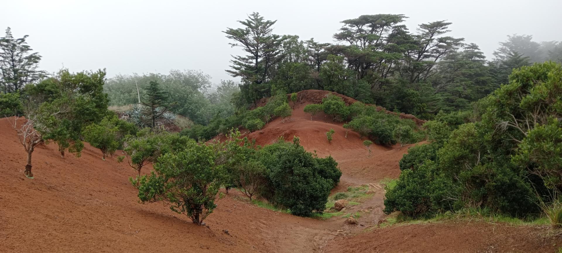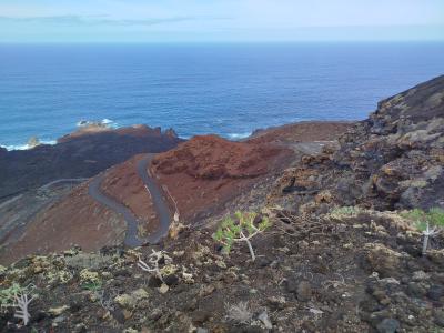 Una empinada, pero breve cuesta nos enlazará con el camino de la Virgen para alcanzar entre el aromático tomillo endémico (Micromeria herrensis) la cumbre airosa expuesta a los aliseos, que a su vez humedecen en esta cota al Pino Verde, Pino Guársamo y Sabina del Agua.